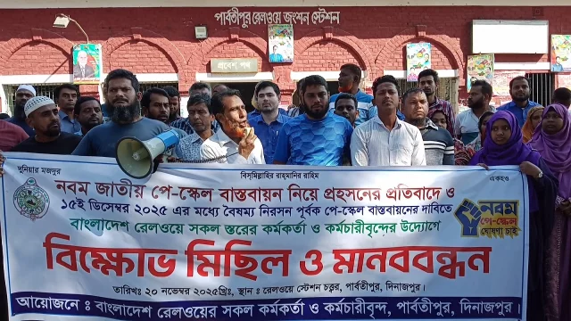 ৯ম জাতীয় পে-স্কেল বাস্তবায়নের দাবিতে দিনাজপুরের পার্বতীপুরে মানববন্ধন ও বিক্ষোভ সমাবেশ করেছে বাংলাদেশ রেলওয়ে জাতীয়তাবাদী শ্রমিক ও কর্মকর্তা-কর্মচারী দল।বৃহস্পতিবার (২০ নভেম্বর) সকাল ১১টায় কেন্দ্রীয় লোকোমোটিভ কারখানা গেটের সামনে এবং পার্বতীপুর রেলওয়ে পার্কে মানববন্ধন ও বিক্ষোভ কর্মসূচি অনুষ্ঠিত হয়।