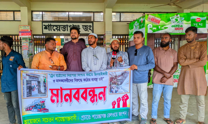 মানববন্ধনে বক্তারা বলেন, শায়েস্তাগঞ্জ রেলওয়ে জংশন দিয়ে প্রতিদিন হাজারো যাত্রী যাতায়াত করলেও দীর্ঘদিন ধরে স্টেশন এলাকায় ছিনতাই, চুরি ও মাদকসেবীদের উৎপাত বেড়ে গেছে। ফলে সাধারণ যাত্রীরা চরম নিরাপত্তাহীনতায় ভুগছেন। দ্রুত এসব অপরাধ দমনে কার্যকর পদক্ষেপ নেওয়ার জন্য সংশ্লিষ্ট কর্তৃপক্ষের প্রতি জোর দাবি জানান তারা।